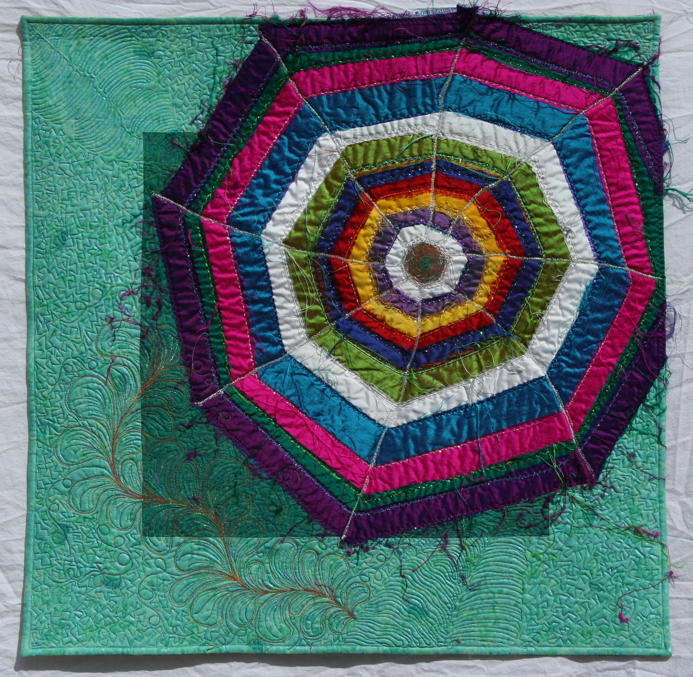 My Grandfather wrote alternate lyrics for the hymn For All the Saints which was sung at family weddings and later his funeral. My first experience of All Saint’s Day was in 1985 while living with my grandfather in Guatemala. Families fly large octagonal kites in the cemetery as memorials for los muertos, their ancestors. The quilt’s background color is taken from the painted crypts in the cemetery at Santiago Sacatepequez. This kite is my memorial of my Gramps, Kenneth L. Pike.
